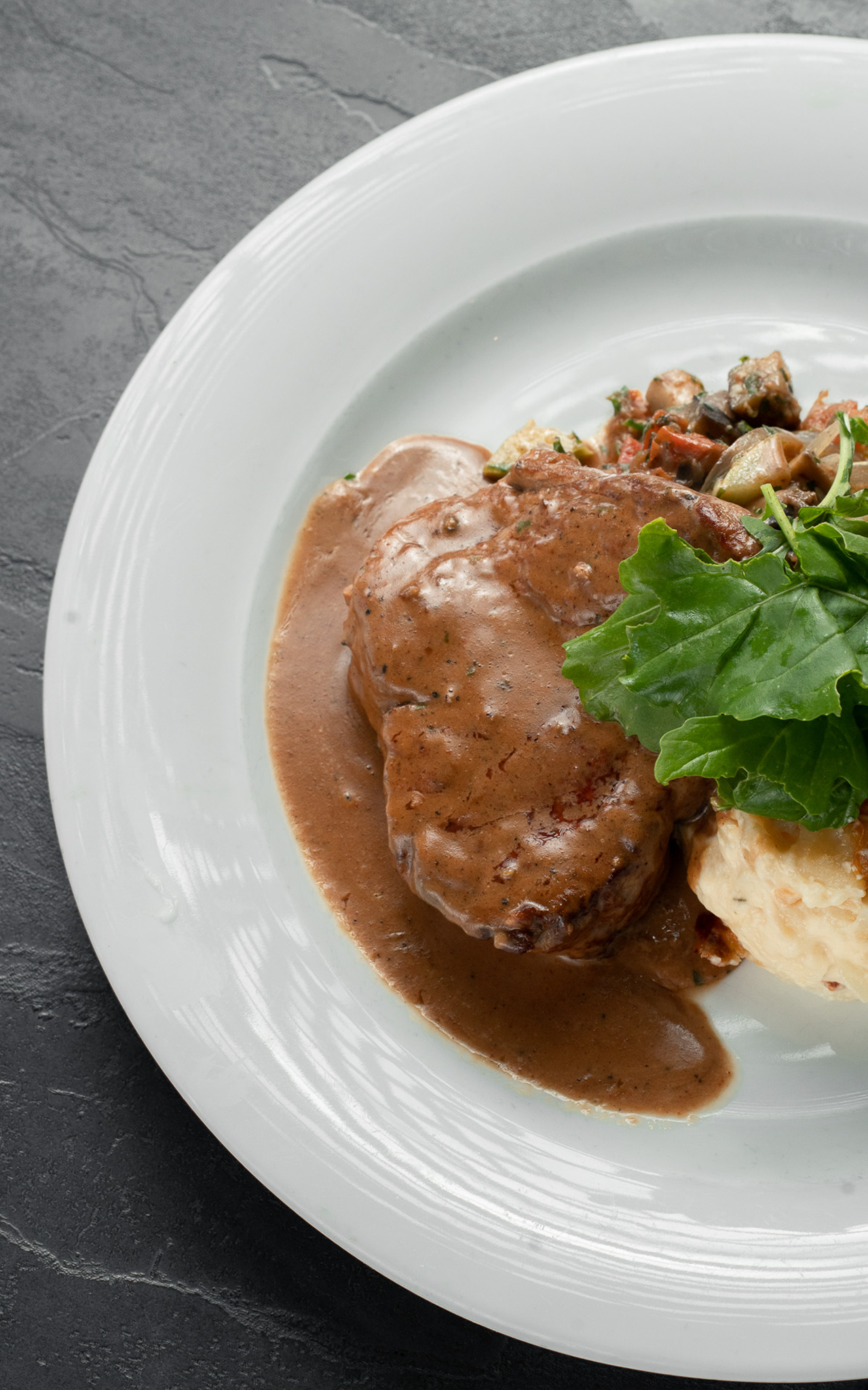 32 DTFilet de poulet tendre, sauce crémeuse aux champignons, herbes fraîches